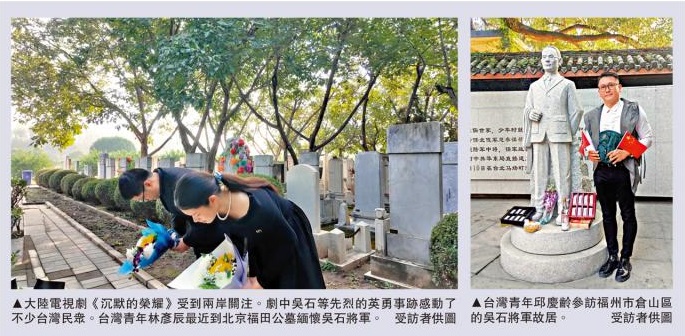 左图:大陆电视剧《沉默的荣耀》受到两岸关注。剧中吴石等先烈的英勇事迹感动了不少台湾民众。台湾青年林彦辰最近到北京福田公墓缅怀吴石将军。右图:台湾青年邱庆龄参访福州市仓山区的吴石将军故居。\受访者供图