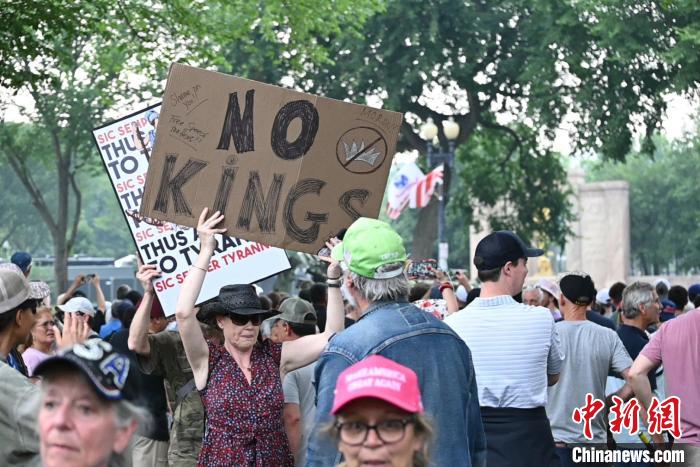中新社记者在阅兵仪式现场看到,也有部分抗议者手举“No Kings”的标语在国家广场内表达自己的立场。